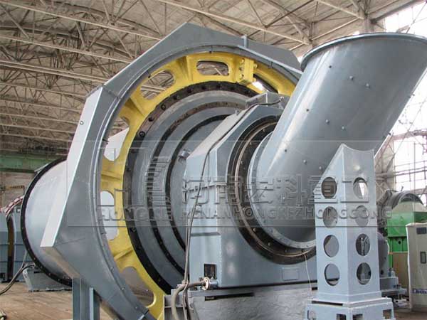 原煤由喂料设备进入到磨机的进料装置中,温度为300℃左右的热风也通过进风管进入进料装置,含有水分的原煤在此处就开始进行热交换;当原煤进入磨机的烘干仓时,由于烘干仓内设有特制的扬料板将原煤扬起,使得原煤在此处进行强烈的热交换而得到烘干,烘干后的煤块通过设有扬料板的双层隔仓板进入粉磨仓。粉磨仓内装有研磨体(钢球),煤块在此仓内被粉碎、研磨成煤粉。在煤块被粉碎的同时,由专用的引风机经过磨机的出料装置将已粉碎的煤粉及气体一同带出磨机,较粗的颗粒会经过出料装置的返料螺旋返回到粉磨仓内进行再次粉磨。